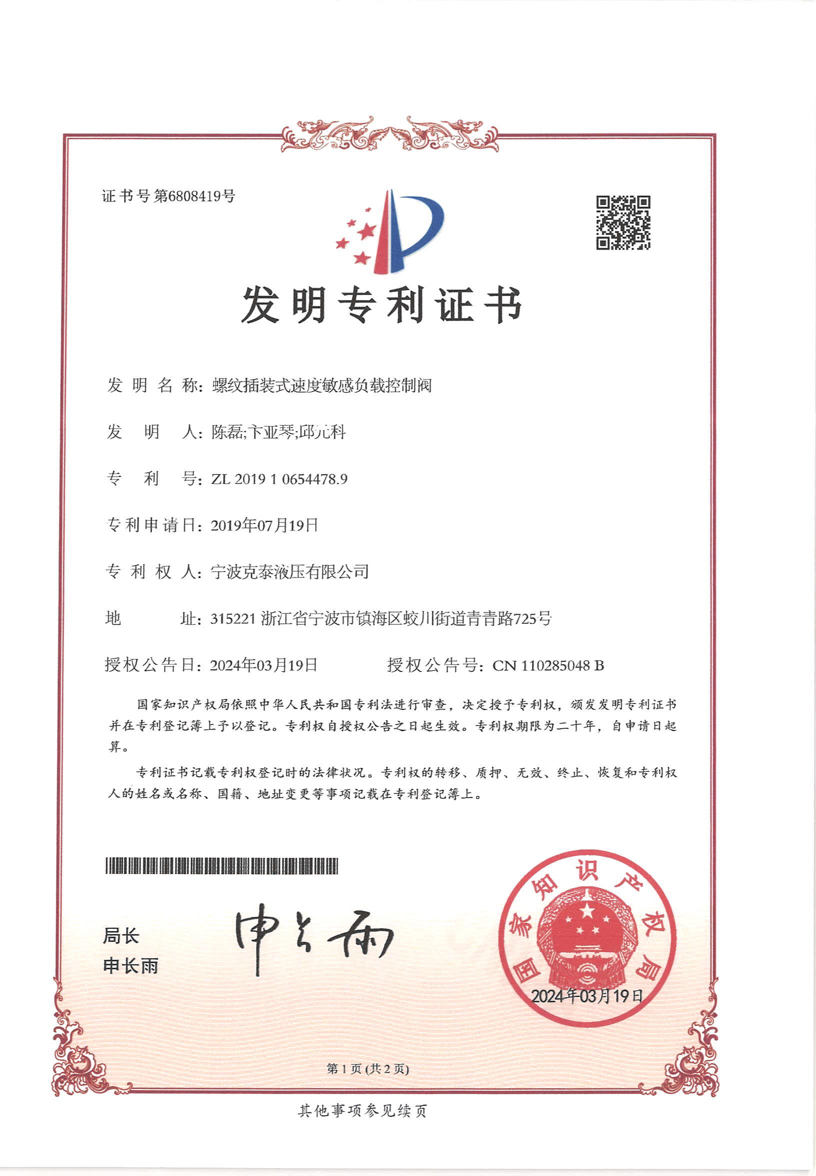 2020年螺纹插装式速度敏感负载控制阀_实用新型专利