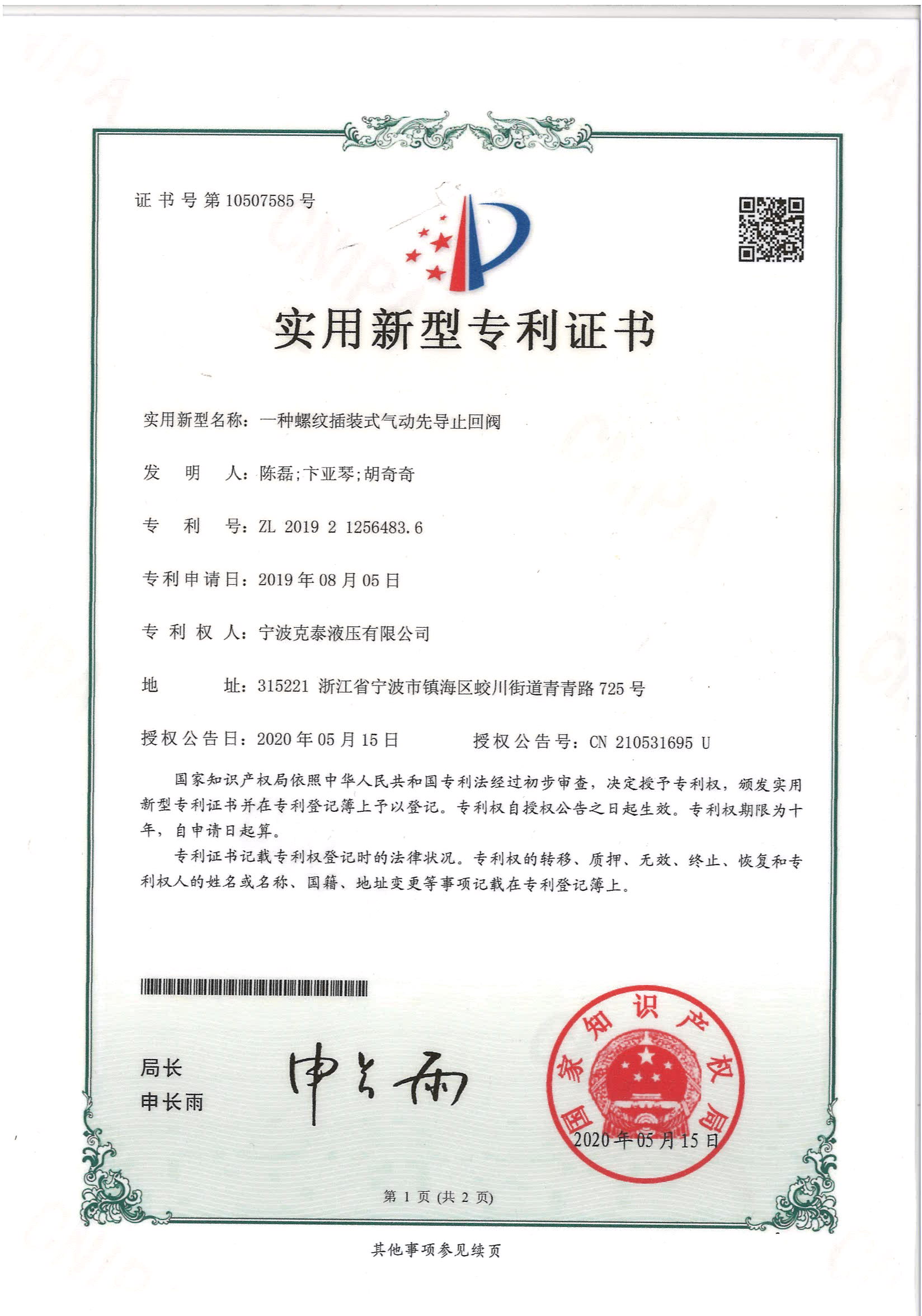 一种螺纹插装式气动先导止回阀实用新型专利