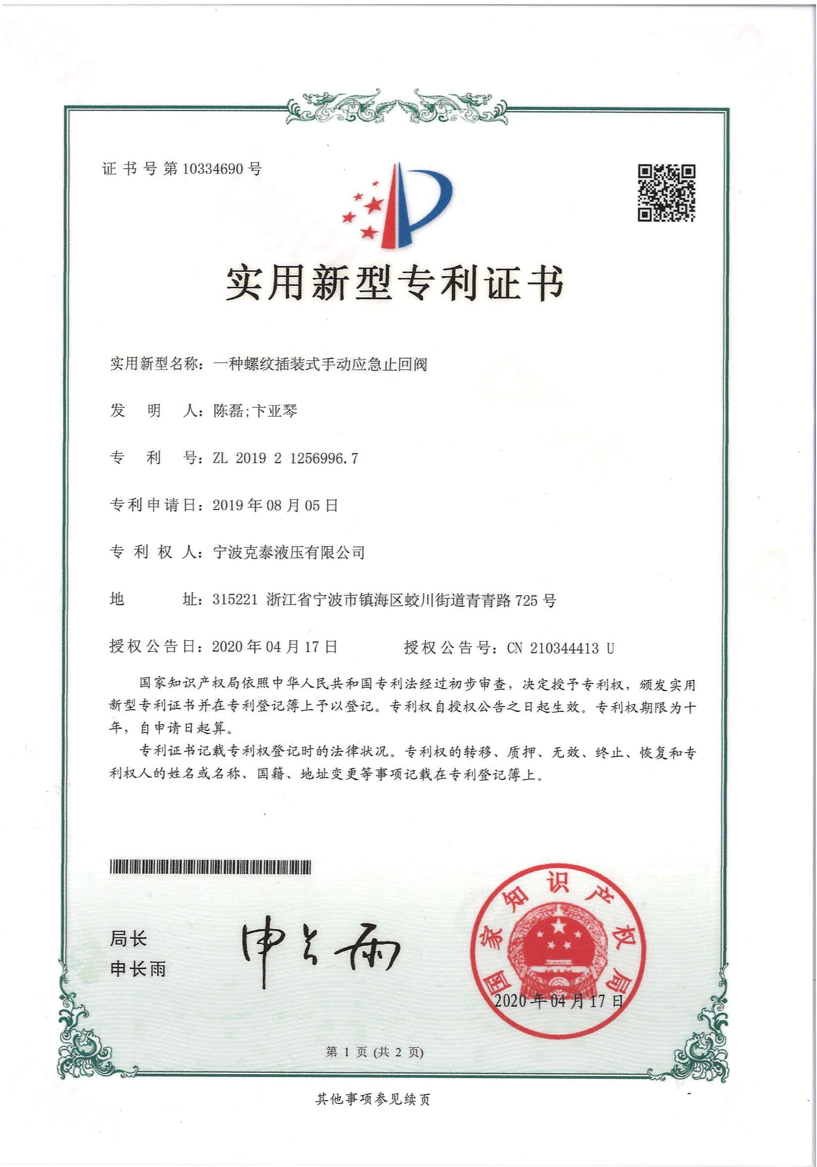 • 2020年一种螺纹插装式手动应急止回阀实用新型专利