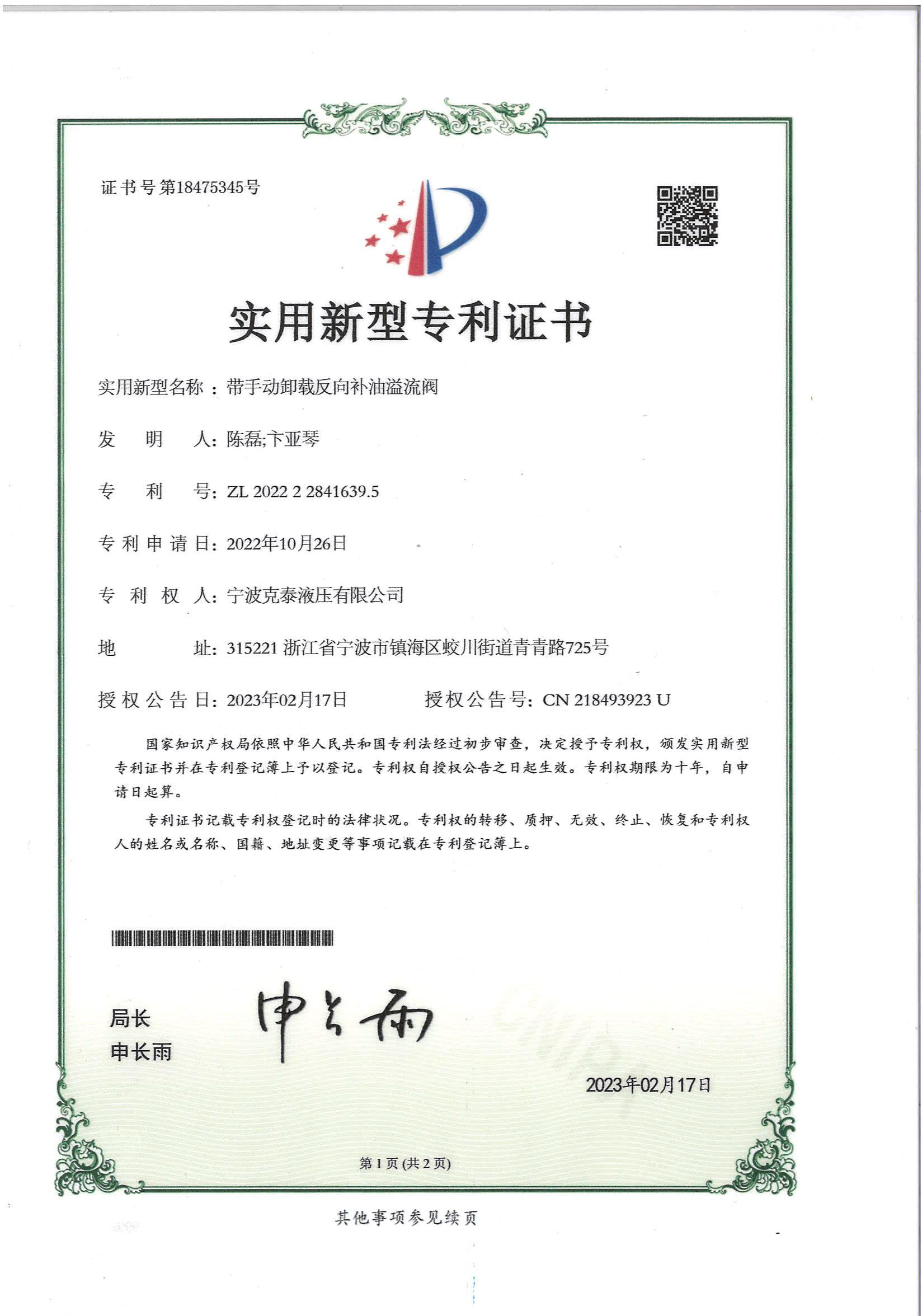 • 2023年带手动卸载反向补油溢流阀实用新型专利