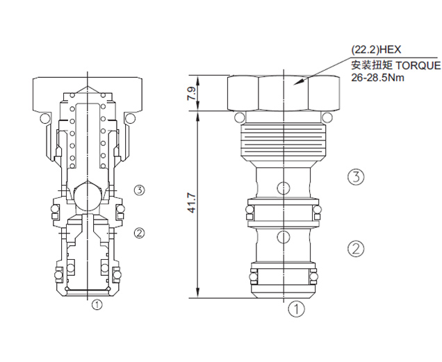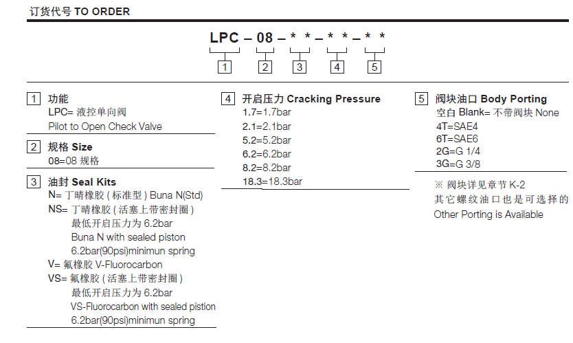 工作压力250Bar流量请查看《压力-流量曲线图》插孔08-3过滤参考《油液清洁度》内泄漏③to②: 3 drops/min(滴/分). (0.15 ml/min.) at 250bar开启压力1.7=1.7bar