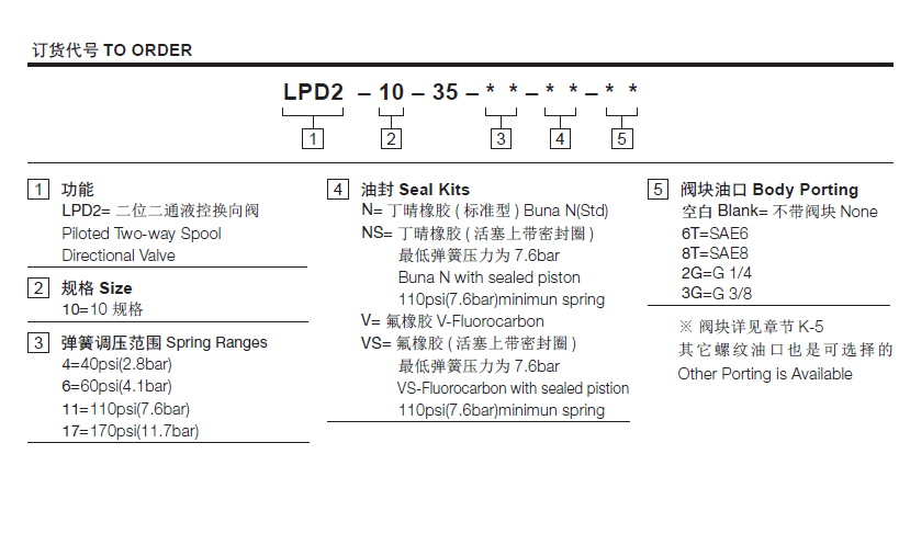 采用7.6bar弹簧(for 7.6bar spring): 8.6bar温度-40°F to +250°F(-40°C to +120°C)油液Mineral-based fluids with viscosities of 7.4 to 420 cSt.(矿物油粘度)阀块材料6061-T6铝,允许使用最大压力207bar 钢和球铁允许使用最大压力350bar -