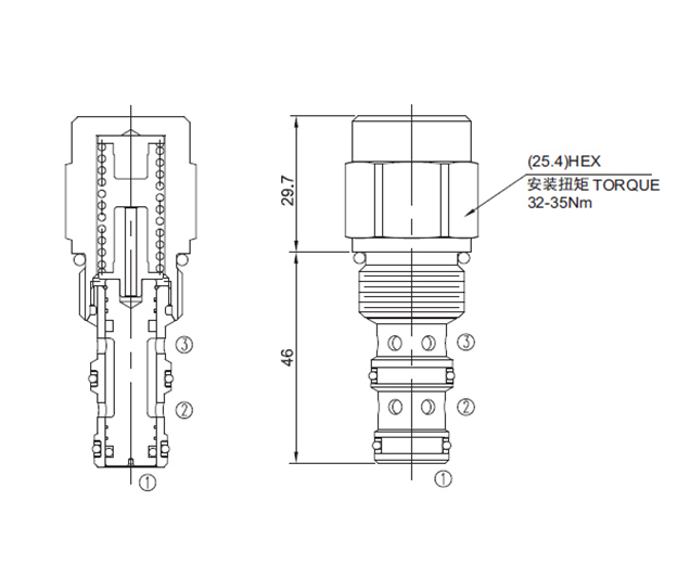 注:③ 处的背压将以 1:1 的比率增加 ① 处所需移动阀芯的液控压力。