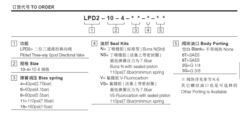 To Full Spool Shift 8.6 bar(125psi)温度-40°F to +250°F(-40°C to +120°C)油液Mineral-based fluids with viscosities of 7.4 to 420 cSt.(矿物油粘度)阀块材料6061-T6铝,允许使用最大压力207bar 钢和球铁允许使用最大压力350bar -