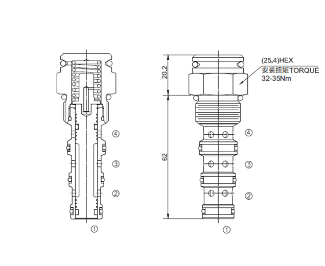 当①口没有先导压力信号时, ③到②双向通, ④口不通。此阀弹簧腔通大气, 阀内