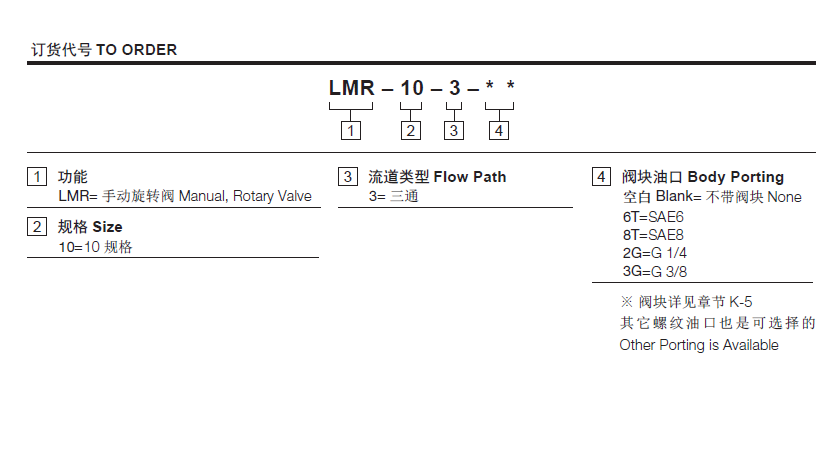 工作压力210Bar流量请查看《压力-流量曲线图》插孔10-3过滤参考《油液清洁度》内泄漏164 cc/min. max. at 210bar温度-40°F to +250°F(-40°C to +120°C)油液Mineral-based fluids with viscosities of 7.4 to 420 cSt.(矿物油粘度)阀块材料6061-T6铝,允许使用最大压力207bar 钢和球铁允许使用最大压力350bar -