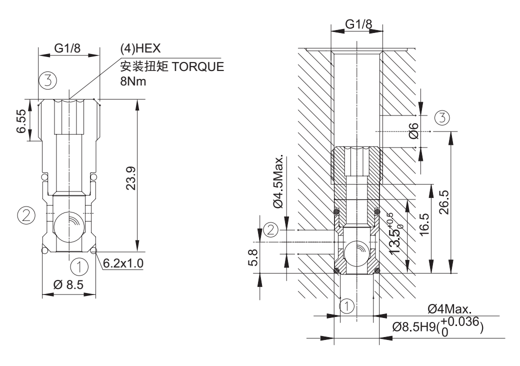 工作压力250Bar流量15L/min插孔见安装尺寸图过滤参考《油液清洁度》内泄漏5 drops/min(滴/分). max. at 250bar温度-40°F to +250°F(-40°C to +120°C)油液Mineral-based fluids with viscosities of 7.4 to 420 cSt.(矿物油粘度)阀块材料6061-T6铝,允许使用最大压力207bar 钢和球铁允许使用最大压力350bar -