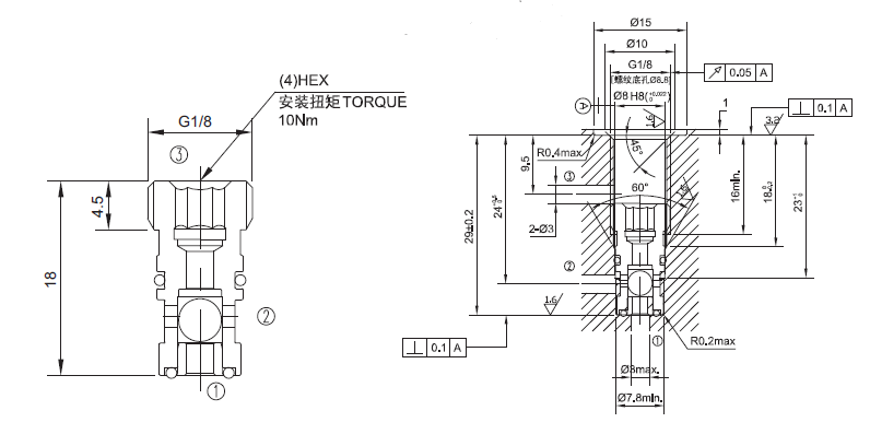 工作压力350Bar流量请查看《压力-流量曲线图》插孔见安装尺寸图过滤参考《油液清洁度》内泄漏5 drops/min(滴/分) Max at 350bar.温度-40°F to +250°F(-40°C to +120°C)油液Mineral-based fluids with viscosities of 7.4 to 420 cSt.(矿物油粘度)阀块材料钢和球铁允许使用最大压力350Bar -