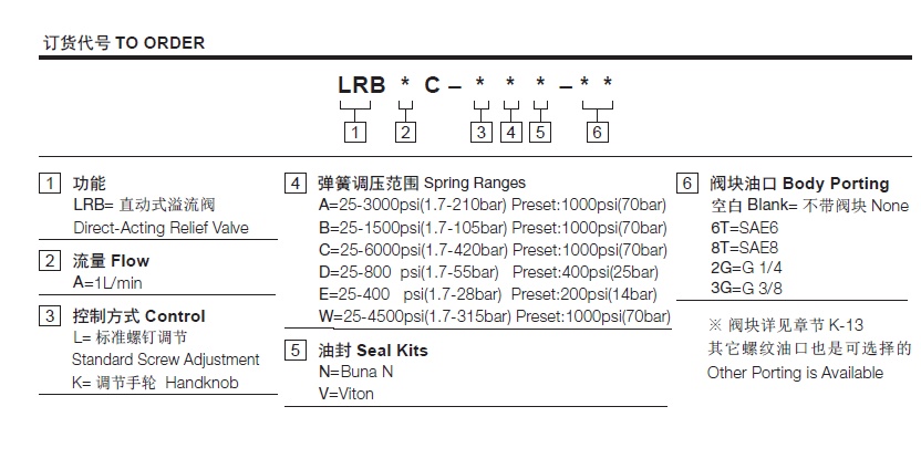 流量请查看《压力-流量曲线图》插孔SUN T-10A过滤参考《油液清洁度》最大工作压力350Bar内泄漏2 drops/min(滴/分).响应时间2 ms弹簧调压范围A:25psi (1.7 bar) to 3000psi(210 bar), preset预设定:1000psi(70 bar)