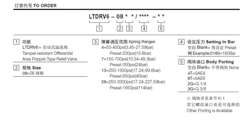 17.24 to 250 bar; preset预设定:124bar温度-40°F to +250°F(-40°C to +120°C)油液Mineral-based fluids with viscosities of 7.4 to 420 cSt.(矿物油粘度)阀块材料6061-T6铝,允许使用最大压力207bar 钢和球铁允许使用最大压力350bar -