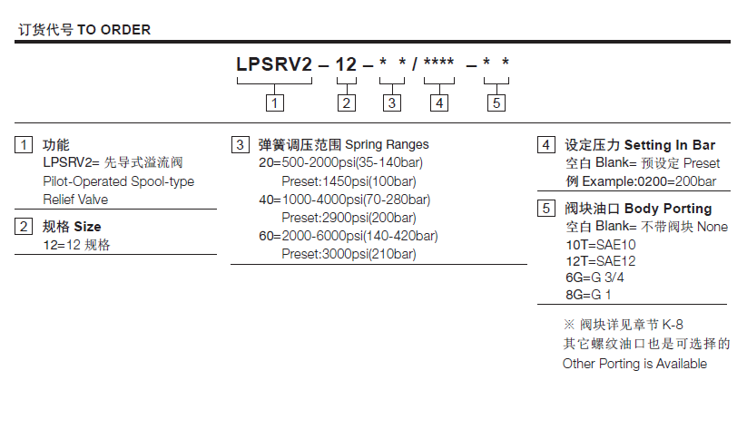 阀体①口和②口不通, 直到①口压力超过设定压力且打开先导阀芯。这样, 先导阀芯