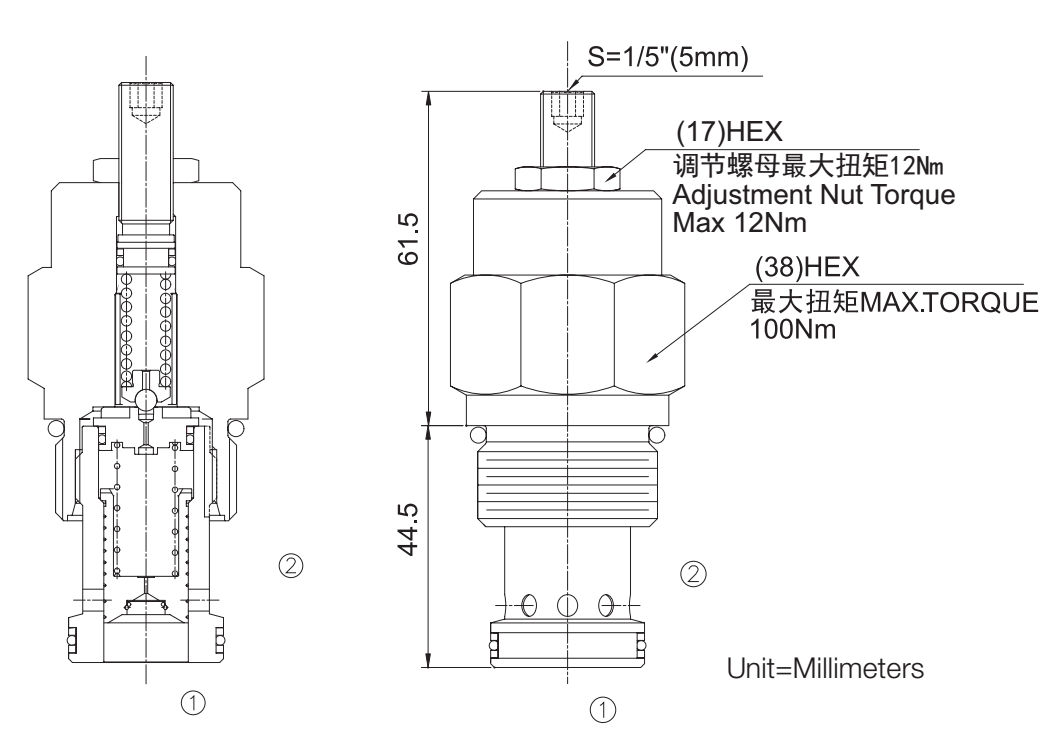 阀体①口和②口不通, 直到①口压力超过设定压力且打开先导阀芯。这样, 先导阀芯