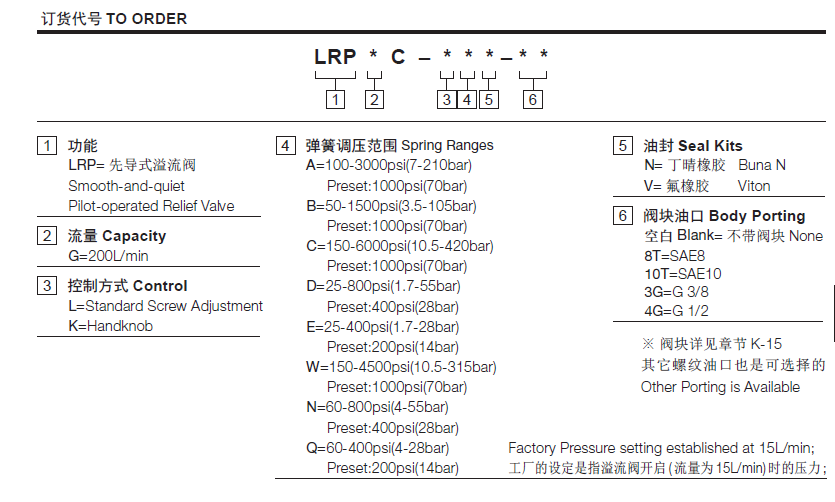 W 10.5 to 315 bar, preset预设定:70bar温度-40°F to +250°F(-40°C to +120°C)油液Mineral-based fluids with viscosities of 7.4 to 420 cSt.(矿物油粘度)阀块材料钢和球铁允许使用最大压力350bar -