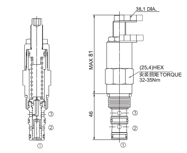 当①口的压力超过预设定的压力10bar 以上时,②口渐渐关闭,①到③开始溢流。