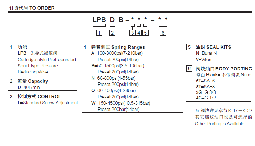 P: 2.8- 28 bar , preset预设定:14bar温度-40°F to +250°F(-40°C to +120°C)油液Mineral-based fluids with viscosities of 7.4 to 420 cSt.(矿物油粘度)阀块材料钢和球铁允许使用最大压力350bar -