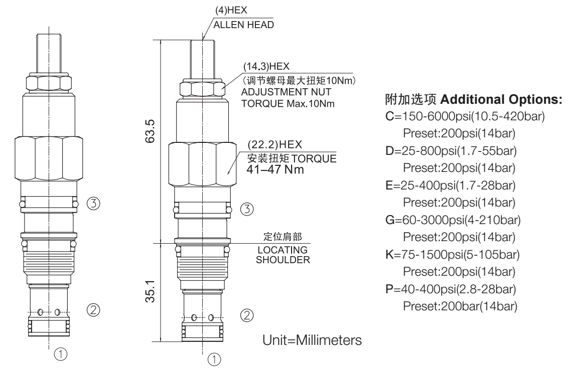 弹簧调节范围:C 和 W,是由进油口最大压力 350Bar 来测试的 ;