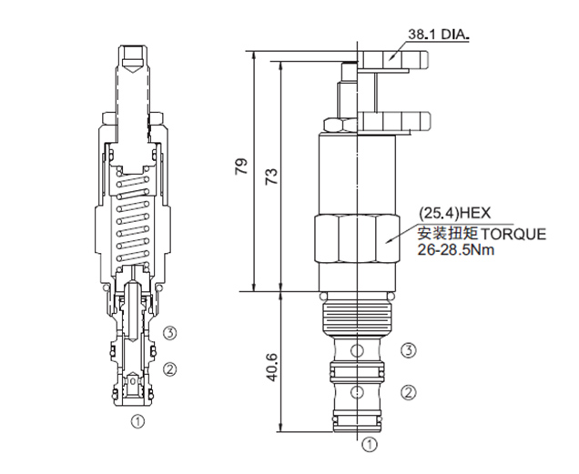 工作压力240bar流量请查看《压力-流量曲线图》插孔08-3过滤参考《油液清洁度》内泄漏82 cc/min. max. to 85% of nominal setting弹簧调压范围3.4- 20.7 bar, preset预设定:10 bar
