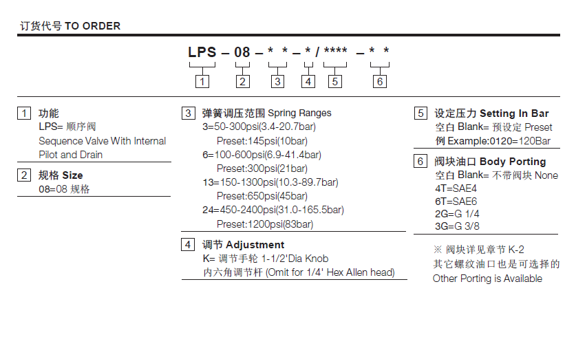 31.0-165.5 bar, preset预设定:83 bar温度-40°F to +250°F(-40°C to +120°C)油液Mineral-based fluids with viscosities of 7.4 to 420 cSt.(矿物油粘度)阀块材料6061-T6铝,允许使用最大压力207bar 钢和球铁允许使用最大压力350bar -