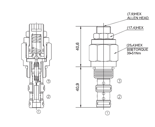常闭型顺序阀, ①到②口关闭。当①口压力升高超过弹簧设定值时,①到②口打开,