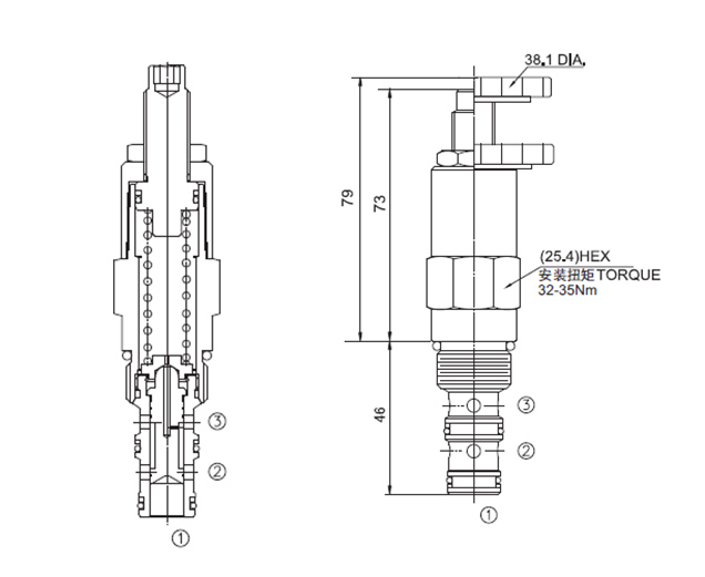 流量请查看《压力-流量曲线图》插孔10-3过滤参考《油液清洁度》内泄漏82 cc/min. max. to 85% of nominal setting弹簧调压范围2.8-28 bar, preset预设定:13.8bar