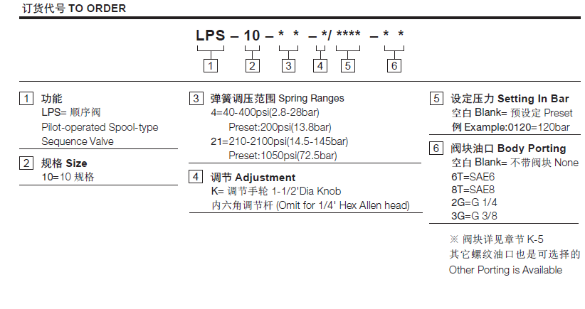 14.5-145 bar, preset预设定:72.5bar温度-40°F to +250°F(-40°C to +120°C)油液Mineral-based fluids with viscosities of 7.4 to 420 cSt.(矿物油粘度)阀块材料6061-T6铝,允许使用最大压力207bar 钢和球铁允许使用最大压力350bar -