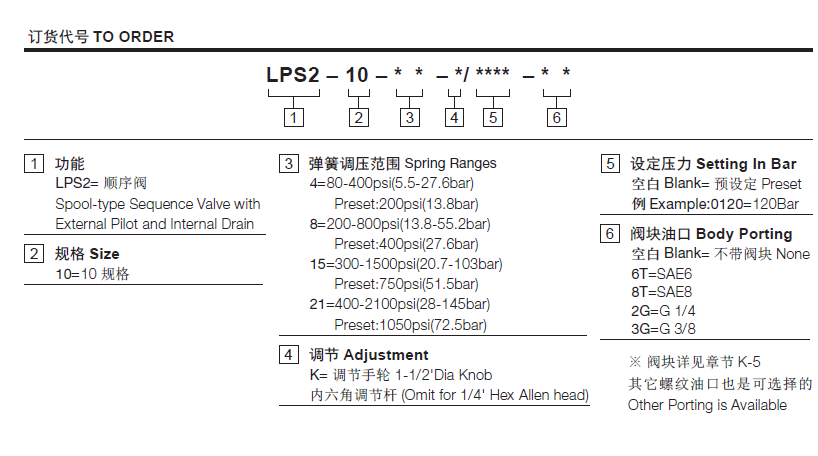 28- 145 bar, preset预设定:72.5bar温度-40°F to +250°F(-40°C to +120°C)油液Mineral-based fluids with viscosities of 7.4 to 420 cSt.(矿物油粘度)阀块材料6061-T6铝,允许使用最大压力207bar 钢和球铁允许使用最大压力350bar -