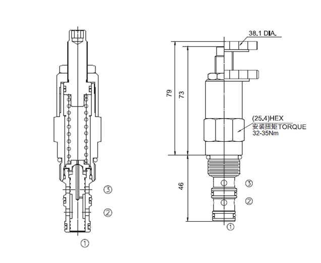 在稳定状态, ③口与②口不通;在①口达到预设定值时,③到②打开。因弹簧腔的液