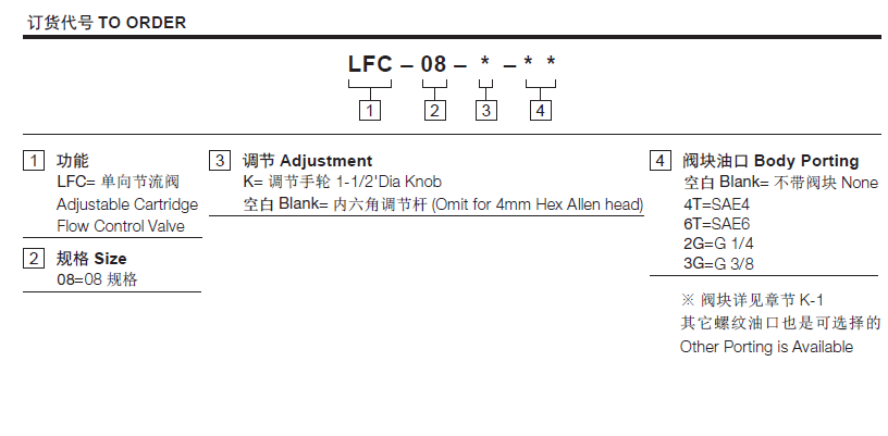 流量请查看《压力-流量曲线图》插孔08-2过滤参考《油液清洁度》最大工作压力250Bar内泄漏3 drops/min(滴/分). max. at shut-off温度-40°F to +250°F(-40°C to +120°C)油液Mineral-based fluids with viscosities of 7.4 to 420 cSt.(矿物油粘度)阀块材料6061-T6铝,允许使用最大压力207bar 钢和球铁允许使用最大压力350bar -
