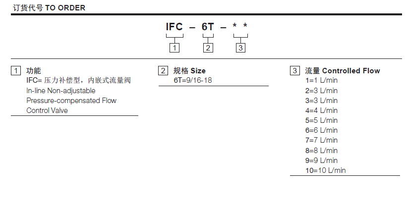 工作压力210Bar流量请查看《压力-流量曲线图》插孔见产品详情页过滤参考《油液清洁度》流量设定1 l/min. min., 10 l/min. max.流量控制精度Nominal flow ±15%温度-40°F to +250°F(-40°C to +120°C)油液Mineral-based fluids with viscosities of 7.4 to 420 cSt.(矿物油粘度)阀块材料6061-T6铝,允许使用最大压力207bar 钢和球铁允许使用最大压力350bar -