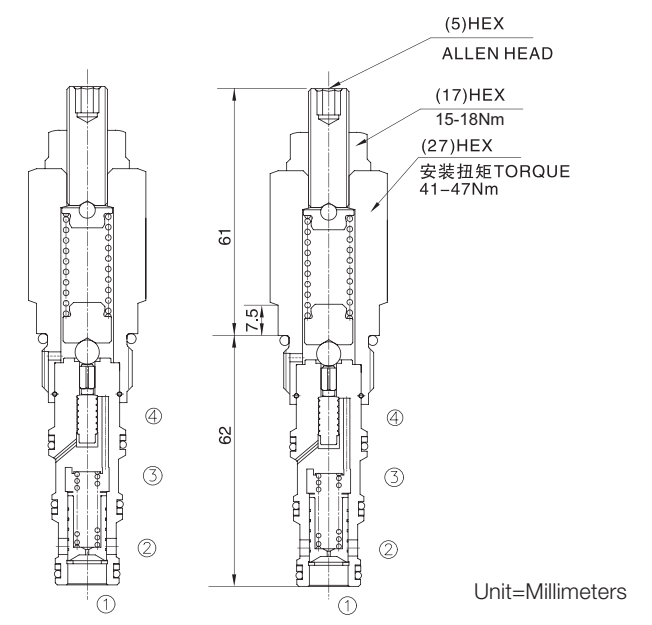 口回油箱,④口的任何压力均叠加到阀的设定值上。