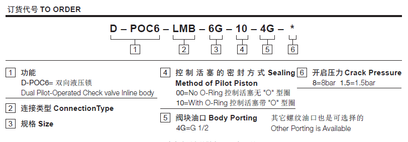 流量请查看《压力-流量曲线图》过滤参考《油液清洁度》最大工作压力350Bar单向阀开启压力8=8bar; 1.5=1.5bar内泄漏2 drops/min(滴/分). max. at 350 bar控制比3.2:1温度-40°F to +250°F(-40°C to +120°C)油液Mineral-based fluids with viscosities of 7.4 to 420 cSt.(矿物油粘度)阀块材料钢和球铁允许使用最大压力350bar -