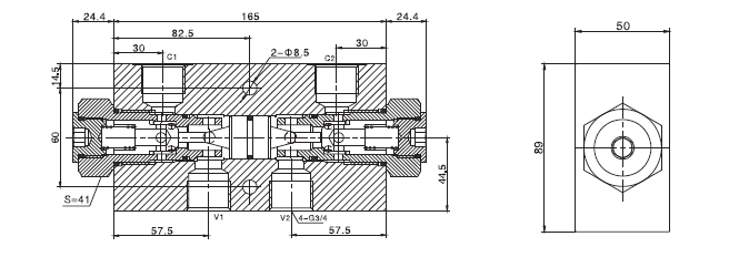 C1 到V1,C2 到V2 关闭. 在相反方向,V1 到C1, V2 到C2 打开。控制比为4:1, 所以在V1 口或V2 口的压力超过C1 口或