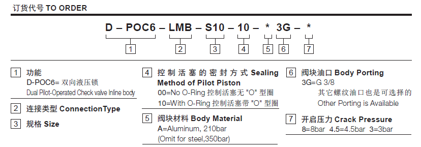 流量请查看《压力-流量曲线图》过滤参考《油液清洁度》最大工作压力350Bar单向阀开启压力8=8bar; 4.5=4.5bar; 3=3bar内泄漏2 drops/min(滴/分). max. at 350 bar控制比7:1温度-40°F to +250°F(-40°C to +120°C)油液Mineral-based fluids with viscosities of 7.4 to 420 cSt.(矿物油粘度)阀块材料钢和球铁允许使用最大压力350bar -