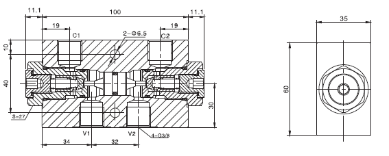 C1 到V1,C2 到V2 关闭. 在相反方向,V1 到C1, V2 到C2 打开。控制比为7:1, 所以在V1 口或V2 口的压力超过C1 口或