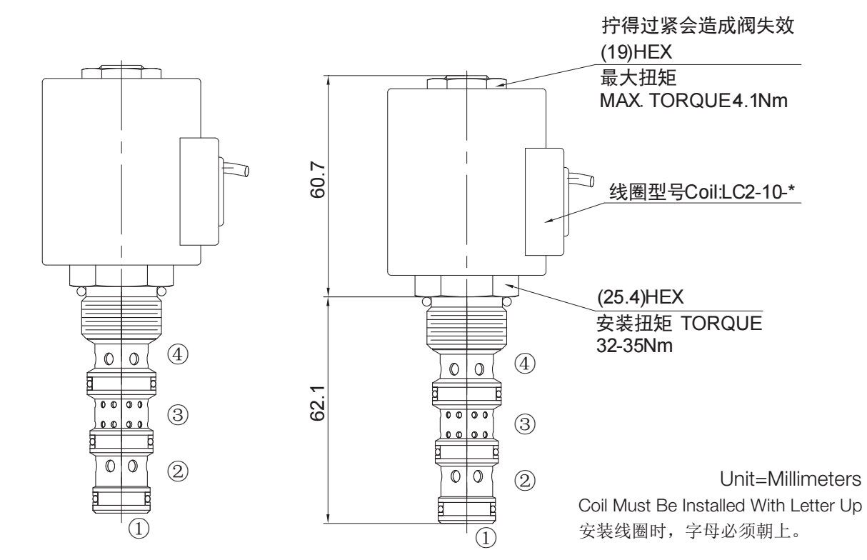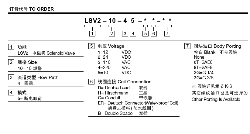 工作压力207bar流量请查看《压力-流量曲线图》插孔10-4过滤参考《油液清洁度》内泄漏82 cc/min.(毫升/分) max. at 207bar温度-40ºF to +212ºF(-40ºC to +100ºC)线圈额定负载Continuous from 85% to 115% of nominal voltage(连续工作电压)油液Mineral-based fluids with viscosities of 7.4 to 420 cSt.(矿物油粘度)阀块材料6061-T6铝,允许使用最大压力207Bar 钢和球铁允许使用最大压力350Bar -