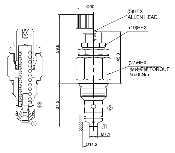 当在①口的压力超过调压弹簧设定的压力时,阀芯打开,①到②通,防止系统过压。