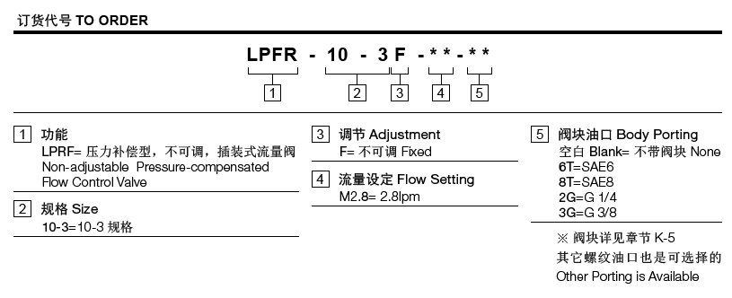 工作压力207bar流量请查看《压力-流量曲线图》插孔10-3过滤参考《油液清洁度》最大流量38lpm流量设定1-19lpm温度-40ºF to +250ºF(-40ºC to +120ºC)油液Mineral-based fluids with viscosities of 7.4 to 420 cSt.(矿物油粘度)阀块材料6061-T6铝,允许使用最大压力207bar 钢和球铁允许使用最大压力350bar -