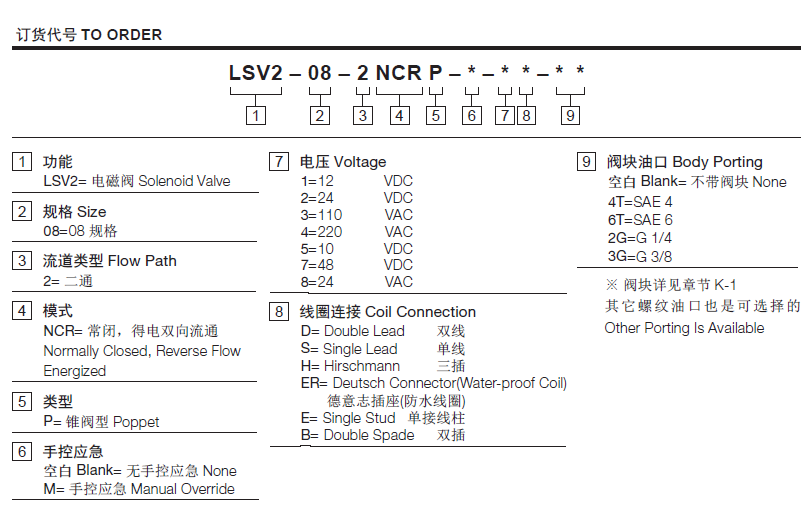 插孔08-2过滤参考《油液清洁度》最大工作压力207Bar内泄漏2 drops/min.(滴/分) max. at 207bar温度-40°F to +212°F(-40°C to +100°C)线圈额定负载Continuous from 85% to 115% of nominal voltage(连续工作电压)油液Mineral-based fluids with viscosities of 7.4 to 420 cSt.(矿物油粘度)阀块材料6061-T6铝,允许使用最大压力207bar 钢和球铁允许使用最大压力350bar -