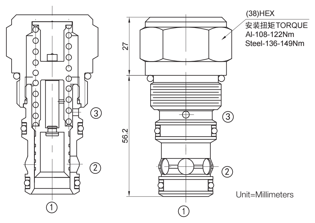 当①口的油压克服弹簧设定压力时,油液从①口到②口流动,③口的压力叠加到了弹