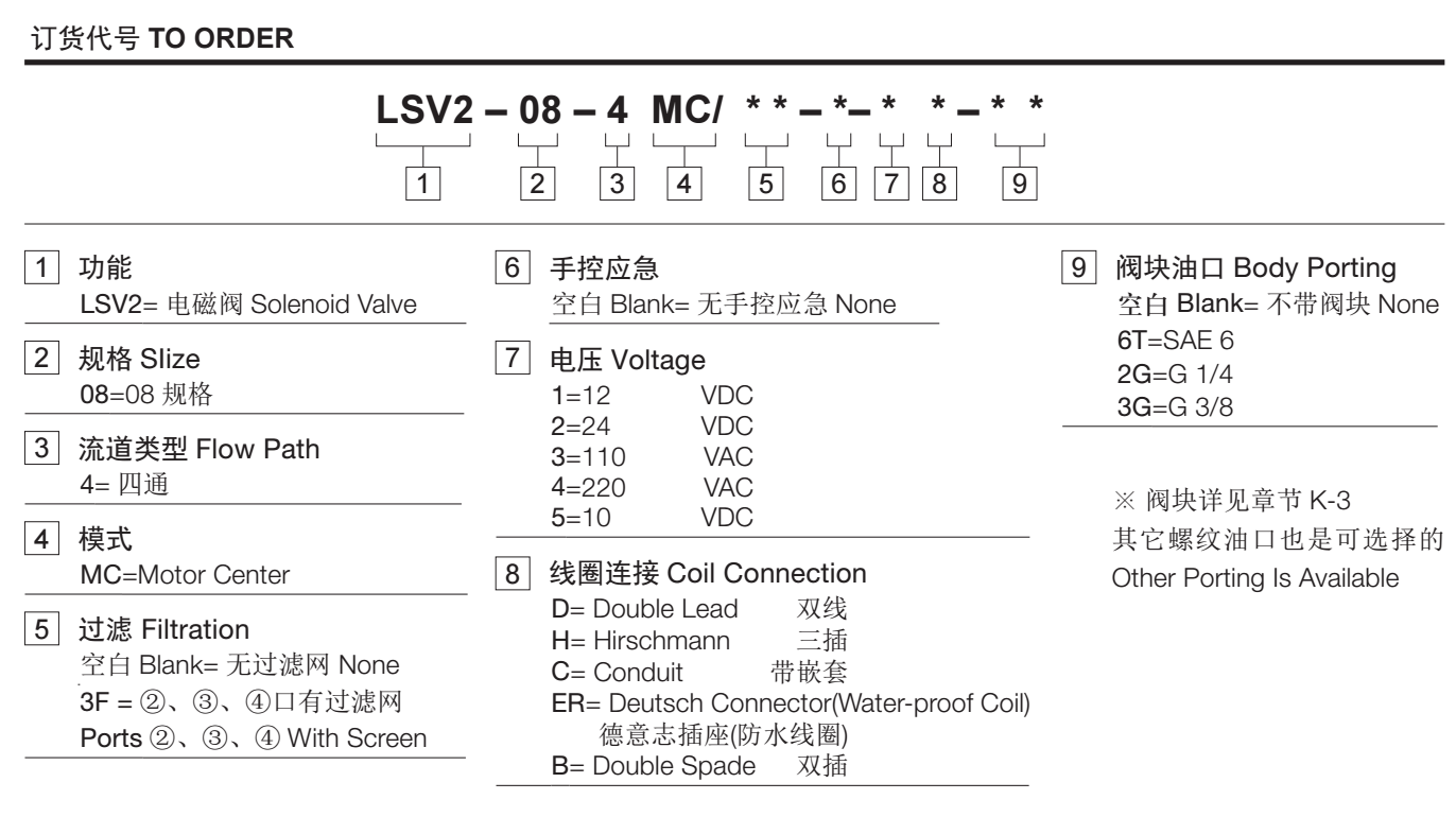 工作压力207Bar流量请查看《压力-流量曲线图》插孔08-4过滤参考《油液清洁度》内泄漏82 cc/min.(毫升/分) max. at 207bar温度-40ºF to +212ºF(-40ºC to +100ºC)线圈额定负载Continuous from 85% to 115% of nominal voltage(连续工作电压)油液Mineral-based fluids with viscosities of 7.4 to 420 cSt.(矿物油粘度)阀块材料6061-T6铝,允许使用最大压力207Bar 钢和球铁允许使用最大压力350Bar -