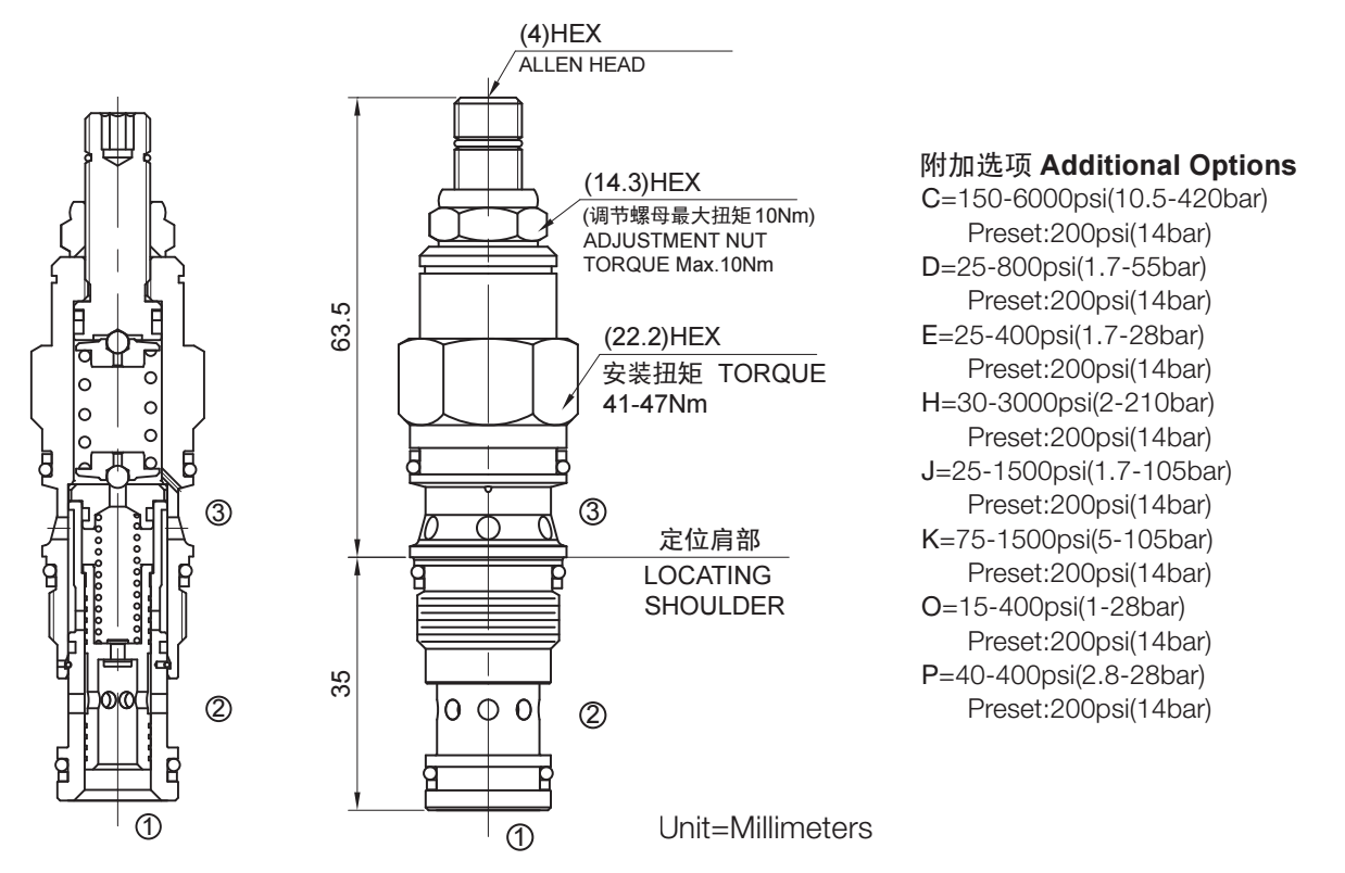 有从①口到③口的全流量溢流功能。油口③的压力按 1:1 叠加到阀的设定上,且油口③的
