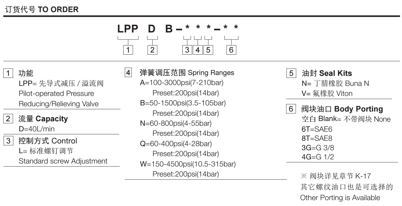 弹簧调节范围:A,B 和 H,②口和①口的最大允许压差为 210Bar;