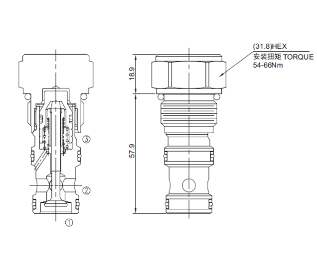 当在③口所需的液压力达到①口负载的1/3 时,阀芯打开,①和②通,液控比为3:1。