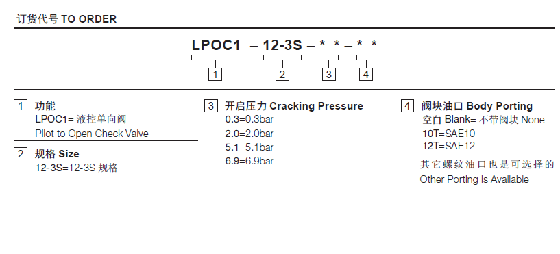 工作压力350Bar流量请查看《压力-流量曲线图》插孔12-3S过滤参考《油液清洁度》内泄漏5 drops/min.(滴/分)Max at 350bar.开启压力0.3=0.3bar