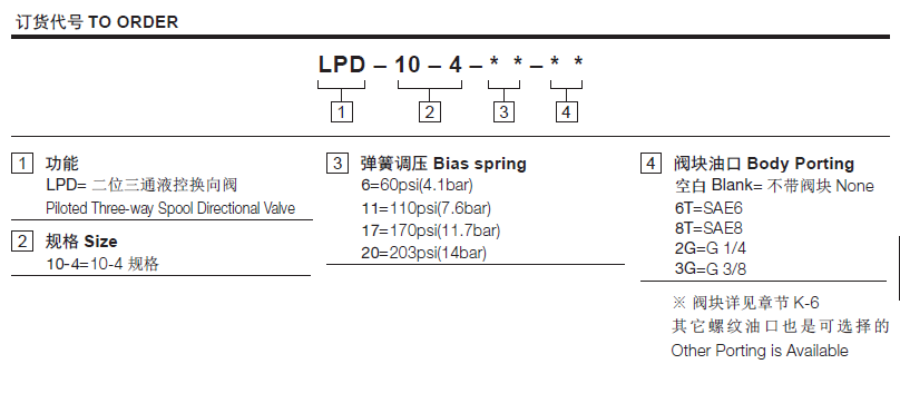 工作压力250Bar流量请查看《压力-流量曲线图》插孔10-4过滤参考《油液清洁度》内泄漏82 cc/min. max. at 250 bar先导口压力要求To Spool Crossover -4.1 bar (60psi) Spring:4.7 bar(68.2psi)