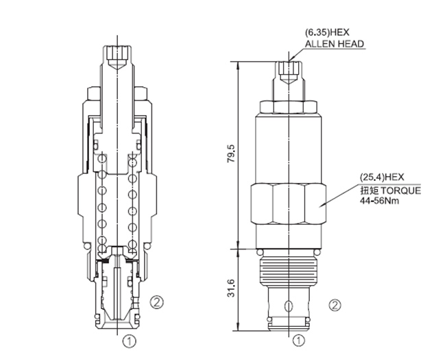 当②口压力达到设定压力时, 从②口到①口打开,以保持系统压力不超过设定值。