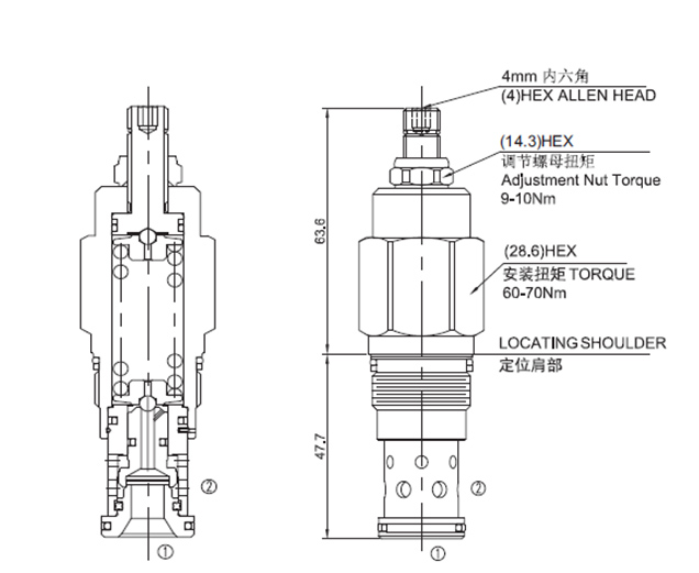 在进口(油口①)达到阀的设定值,阀开始向油箱(油口②)溢流,节流以限制压力