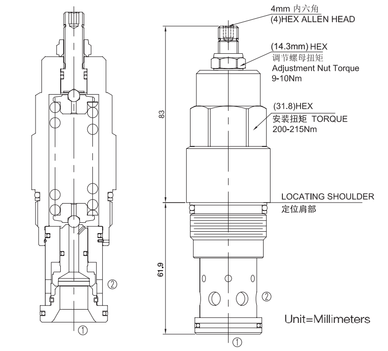 在进口(油口①)达到阀的设定值,阀开始向油箱(油口②)溢流,节流以限制压力