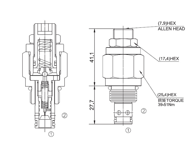 阀体①口和②口不通,直到①口压力超过设定压力且打开先导阀芯。这样, 先导阀芯