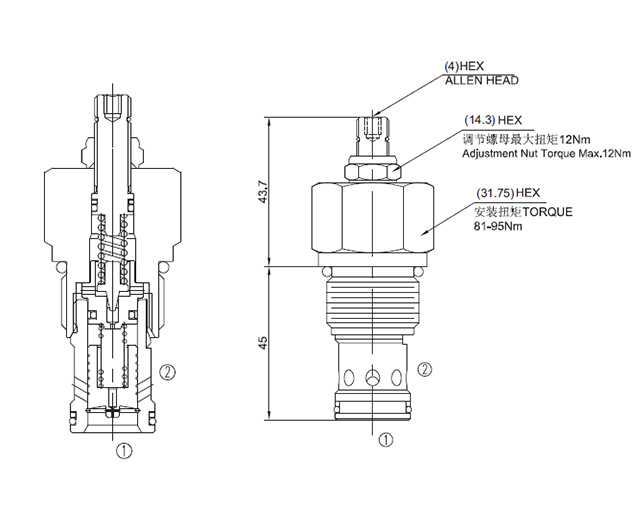 阀体①口和②口不通, 直到①口压力超过设定压力且打开先导阀芯。这样, 先导阀芯